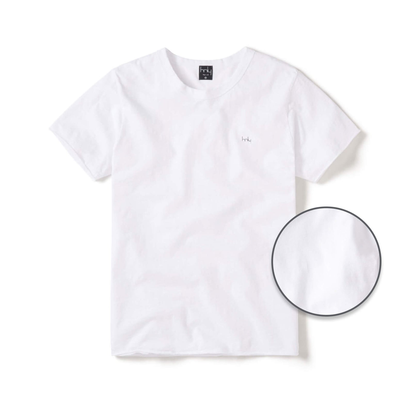 Signature HNLY tee. 100% organic cotton. Olive, white or black. "hnly" embroidered on the chest. The raw hem on the sleeve and bottom with a rolled hem detail on the neckline.